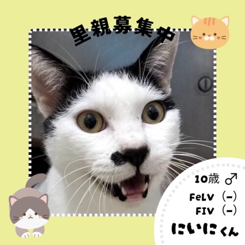 2026年1月19日 里親募集中の猫ちゃん紹介 news ⭐里親募集⭐ 名前:にぃにちゃん 年齢:10歳 性別:♂ ワクチン:済 去勢手術:済 FeLV・FIV(-) 病歴(-) 🐱性格 とても人慣れしています。 目が見えませんが、トイレも失敗なくご飯もよく 食べてくれています✨ 【他の動物さんがいない、落ち着いた環境が向いています🍁】 詳しくは電話にてお問い合わせ下さい🦒