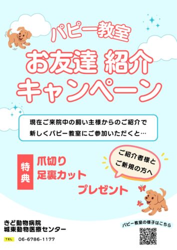 2026年2月21日 パピー教室 お友達紹介キャンペーン🐶 news こんにちは! きど動物病院からのお知らせです📢 この度、 「パピー教室 お友達紹介 キャンペーン」を実施いたします! 現在ご来院中の飼い主様からのご紹介で新しくパピー教室にご参加いただくと… ご紹介者様と御新規の方へ ・爪切り ・足裏カット をプレゼント🎁✨️ さらに!! 初めての方は、 初回お試し¥1500(込)で授業に参加できちゃいます! この機会にぜひご参加ください(^▽^)/ お気軽に当院のスタッフまでお声がけください🙇🏻♀️ TEL📞:06-6786-1177