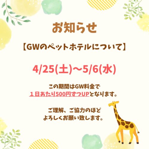 2026年4月24日 GW期間のホテル料金upのお知らせ news こんばんは!きど動物病院です🦒 【GW期間のホテル料金upのお知らせ】 4/25(土)〜5/6(水)のGW期間はホテル料金を、 1日あたり500円ずつupさせていただいております。 ご理解とご協力の程、よろしくお願い致します🙇🏻♀️